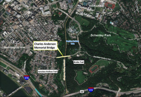 The City of Pittsburgh has announced that – in anticipation of necessary repairs – the Charles Anderson Bridge will close today to vehicular traffic, effective immediately. The bridge will remain open to pedestrians and bicyclists, as will the Junction Hollow Trail below the bridge. |